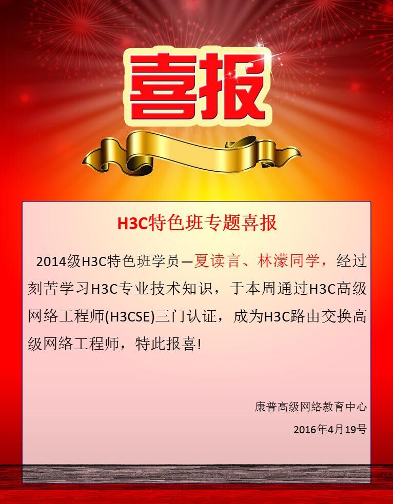2014级H3C特色班学生—夏读言、林濛同学,经过刻苦学习H3C专业技术知识,于本周通过H3C高级网络工程师(H3CSE)三门认证,成为H3C路由交换高级网络工程师,特此报喜!
