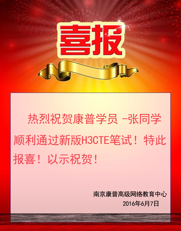 恭喜我中心学员-张同学,经过为期一个月的刻苦学习和老师精心辅导下,终于迎来了好消息,顺利通过新版H3CTE笔试!特此报喜!